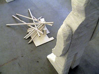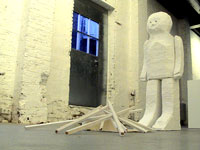 gipsweiße Gestalt aus dem Galerieraum. Einen FuB in der Galerie,